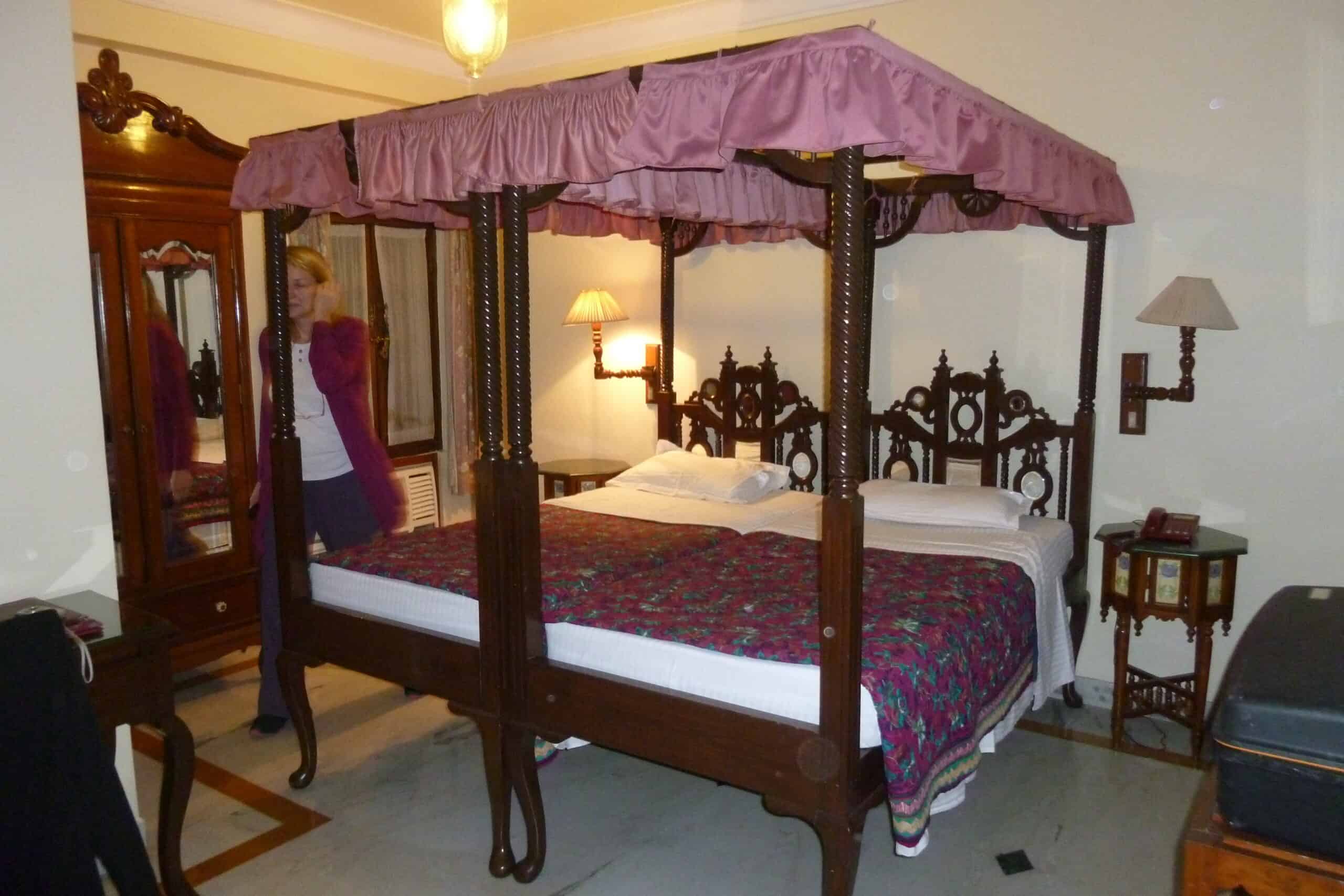 Nach 6 Stunden Fahrt kommen wir endlich in Jaipur an. Beim Anblick unseres Hotels stockt uns mal wieder fast der Atem – es ist wie aus 1001 Nacht. Aber wir sind einfach zu müde, um uns noch lange mit Staunen aufzuhalten. Das muss bis morgen warten. Und unser Nachtlager ist wirklich sehr einladend.