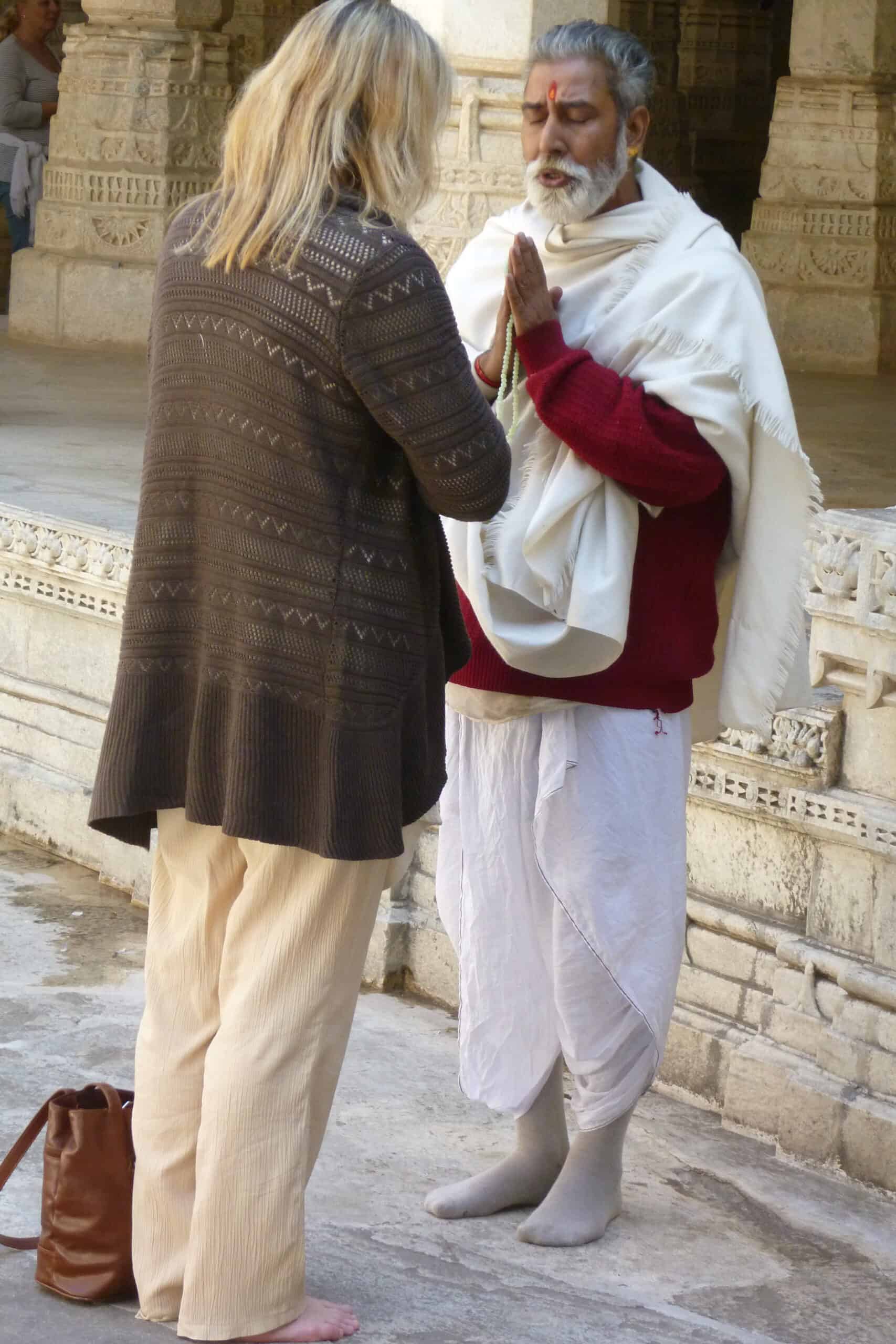 Bei den Jainas gibt es noch eine Besonderheit: Es gibt Priesterinnen, die weiß gewandet (und mit Mundschutz, um ja nicht aus Versehen eine Fliege oder Mücke zu verschlucken) durchs Land reisen, stets barfuß unterwegs sind und keinerlei materielle Güter besitzen. Auf ihren Pilgerreisen kehren sie bei Glaubensbrüdern und -schwestern ein und jede Familie, bei der sie anklopfen, wird sie mit Freuden aufnehmen, denn diese Familie fühlt sich gesegnet, eine solche Priesterin beherbergen zu dürfen. Überhaupt ist Religion hier in Indien bei allen Leuten, die ich bisher getroffen habe, ein großes Thema. Das konnte ich auch bei meiner späteren Reise immer wieder feststellen. Ich komme sicher wieder darauf zurück.