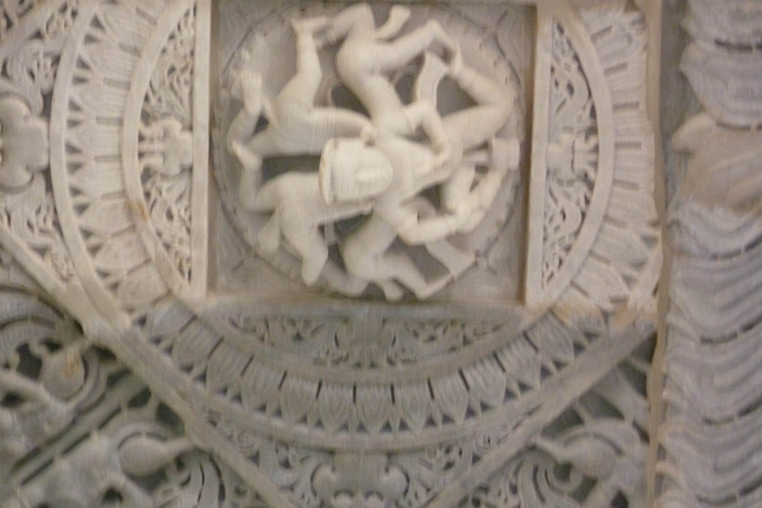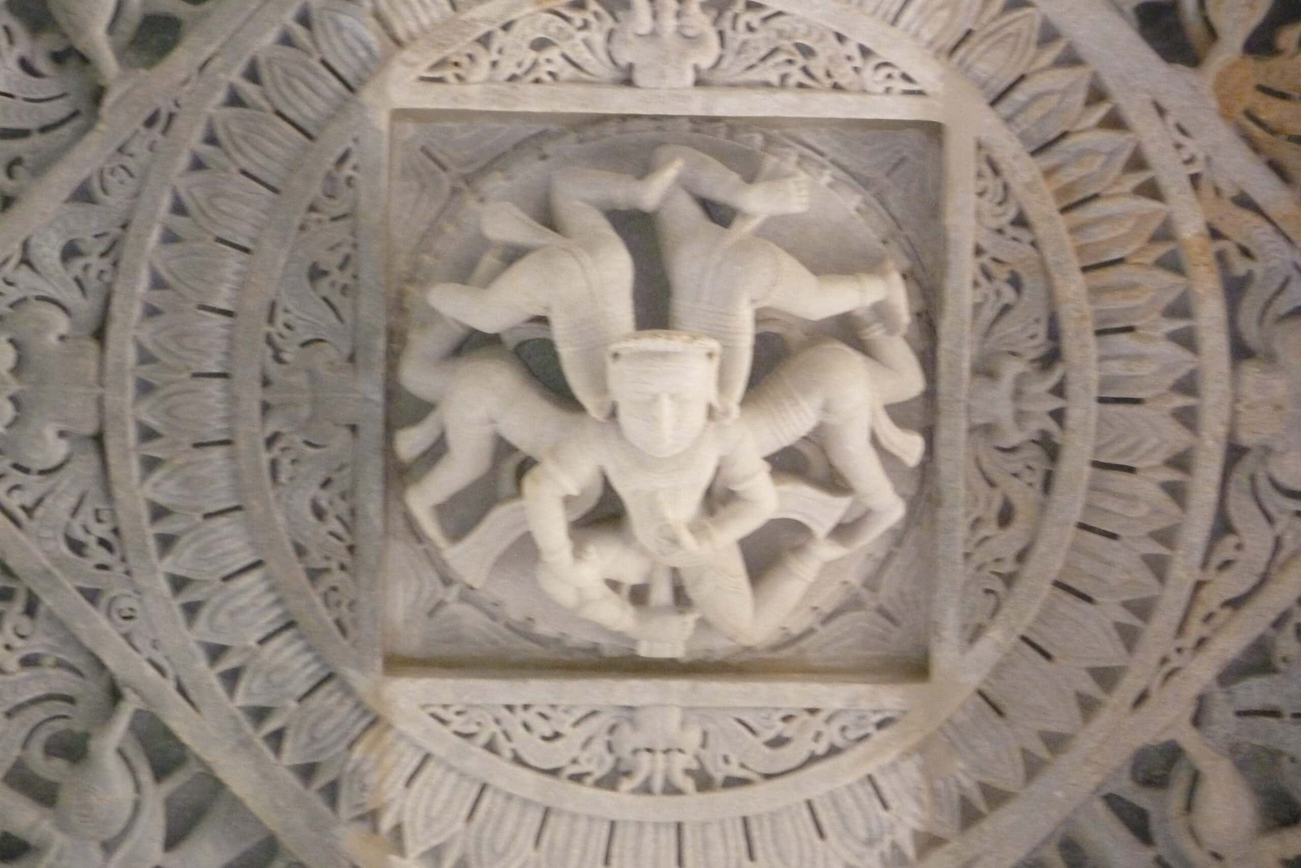Eine Skulptur im Tempel zeigt einen Kopf mit fünf Körpern. Das Interessante daran ist, dass der Kopf je nach Betrachtungswinkel immer mit einem anderen Körper verbunden zu sein scheint.