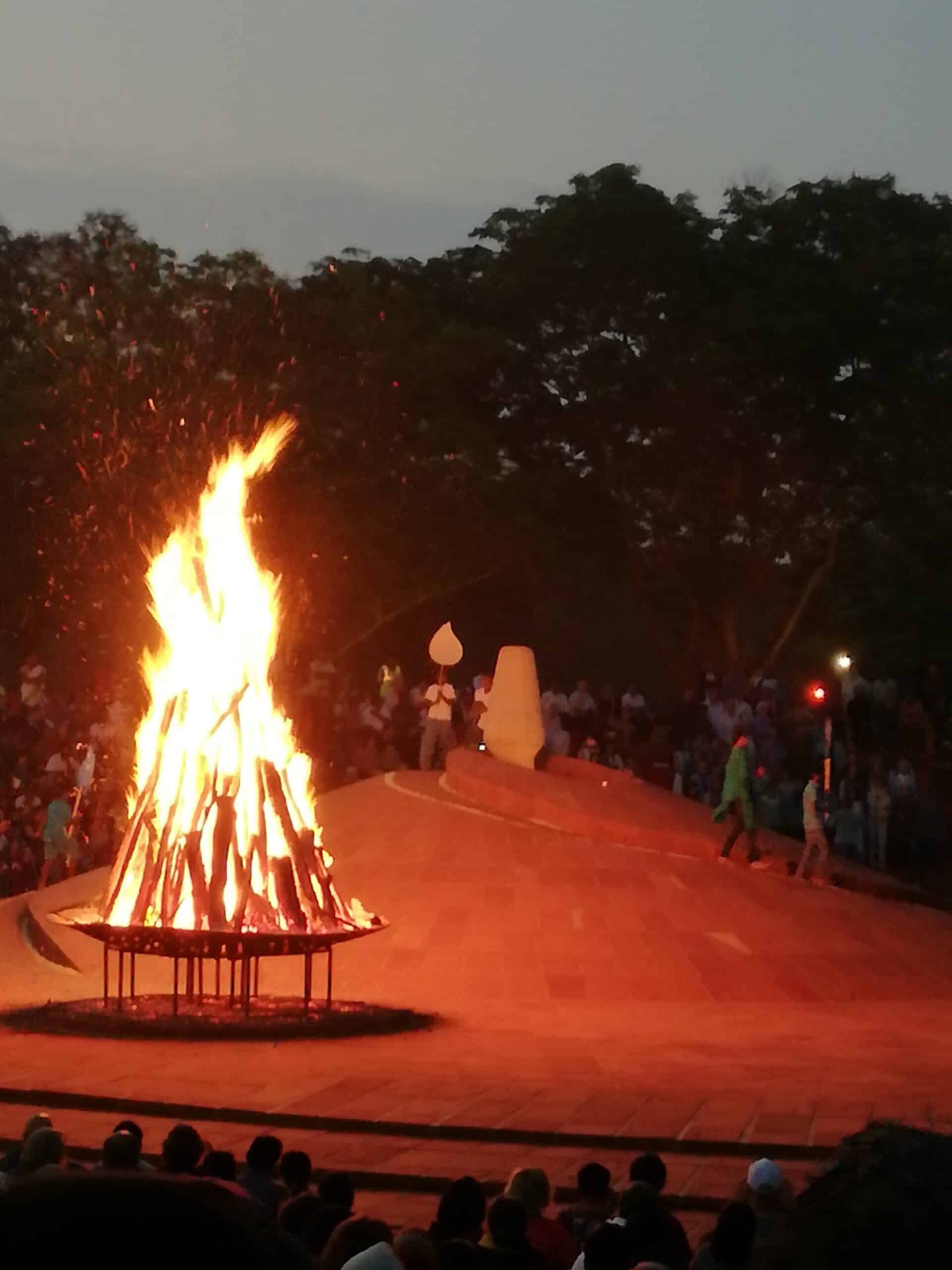 Gegen 6:00 Uhr wurde ein Feuer entzündet, das hell in den immer noch dunklen Himmel loderte. Während es sich langsam durch die aufgeschichteten Zweige fraß, wurden Originalaufnahmen aus dem Gründungsjahr von „der Mutter“ auf Französisch abgespielt, deren Botschaft dann auch auf Englisch und in verschiedenen indischen Dialekten zu Gehör gebracht wurde.