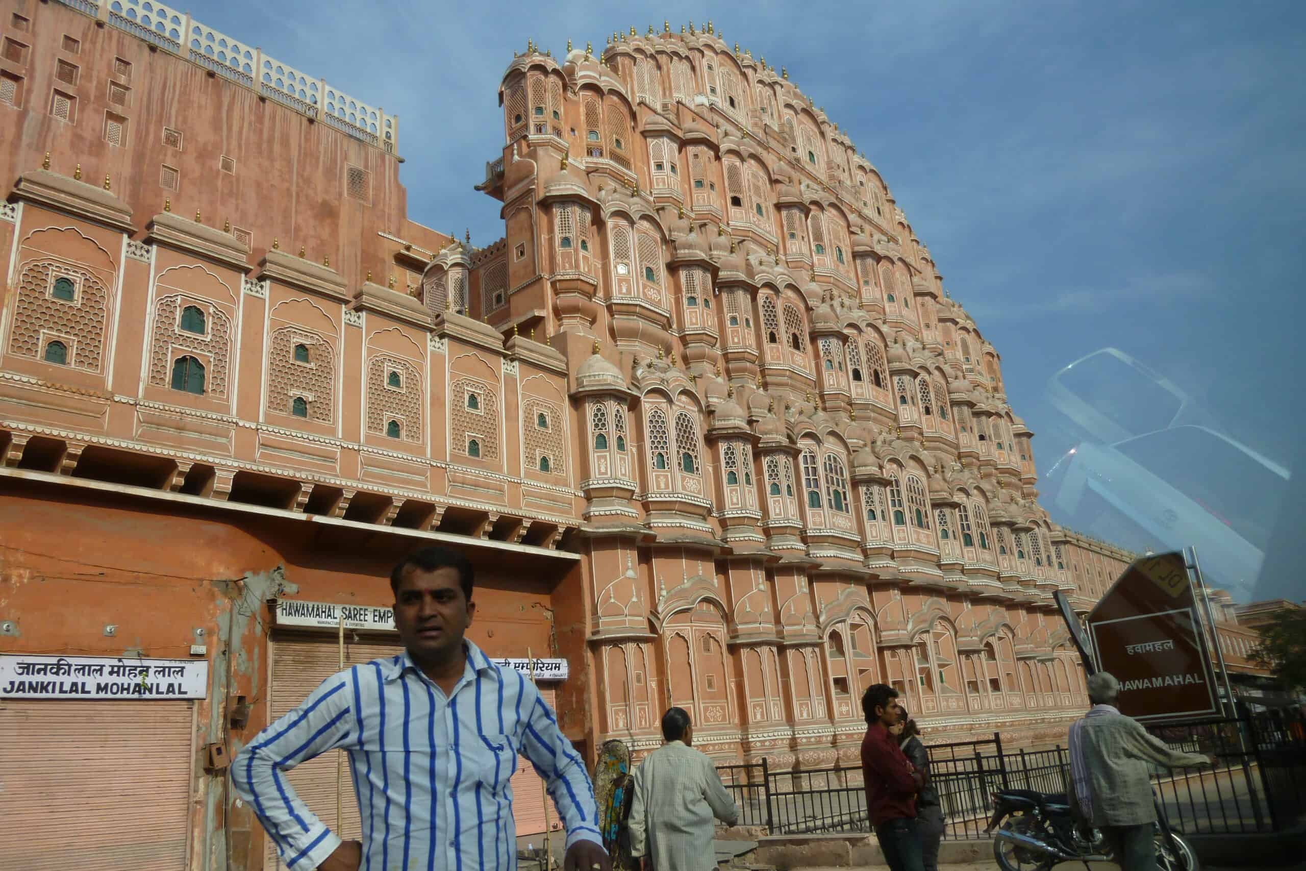 Mitten in Jaipur steht ein weiterer Palast, den wir uns eigentlich viel schöner vorgestellt haben. Es ist das fünfstöckige Hawa Mahal – der Palast der Winde, der seinen Namen den 953 Gitterfenstern in der Fassade verdankt. Er steht mitten in der Altstadt von Jaipur, umringt von kleinen Ladenlokalen, die es so schon seit dem 16. Jahrhundert gibt – erzählt man uns.
