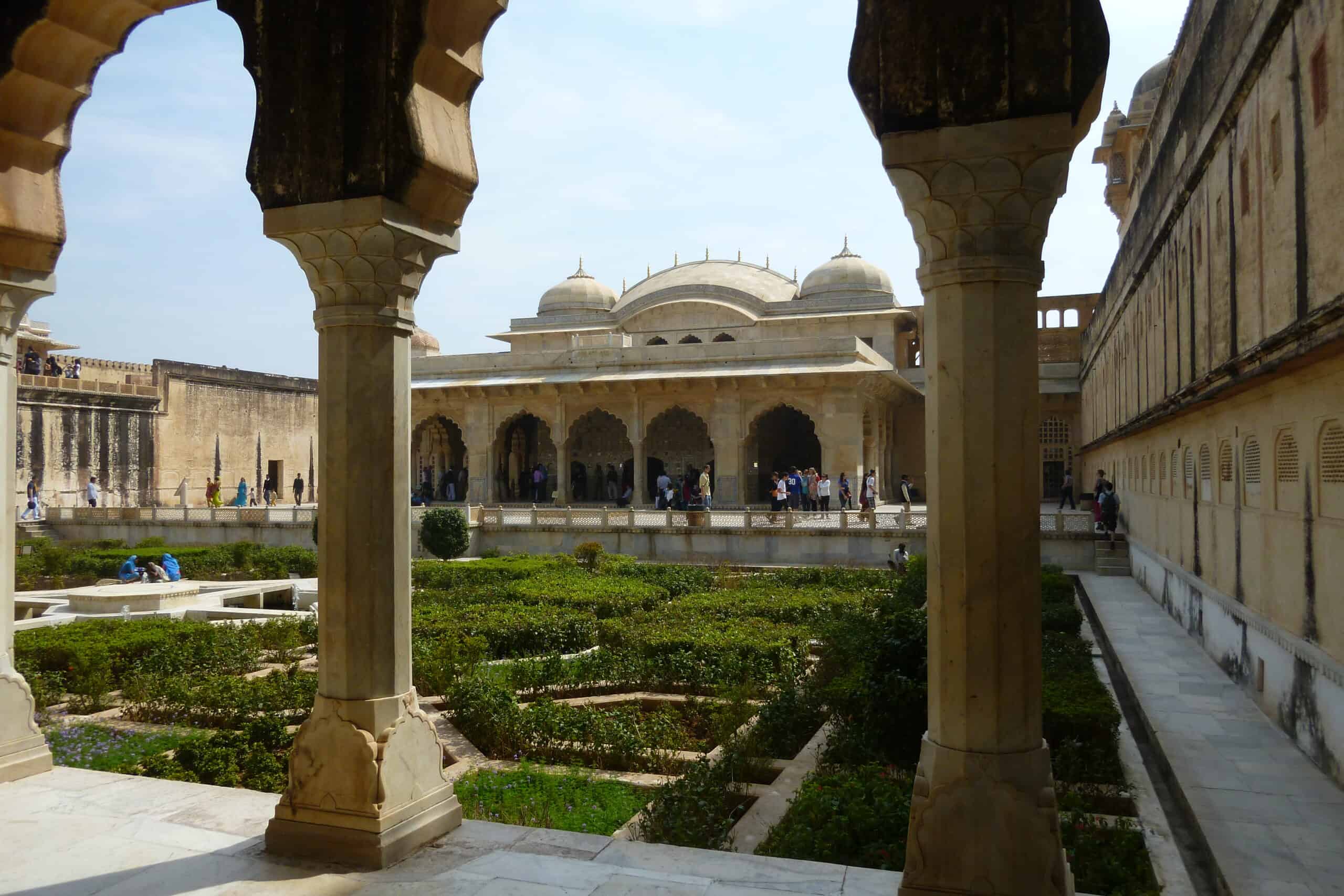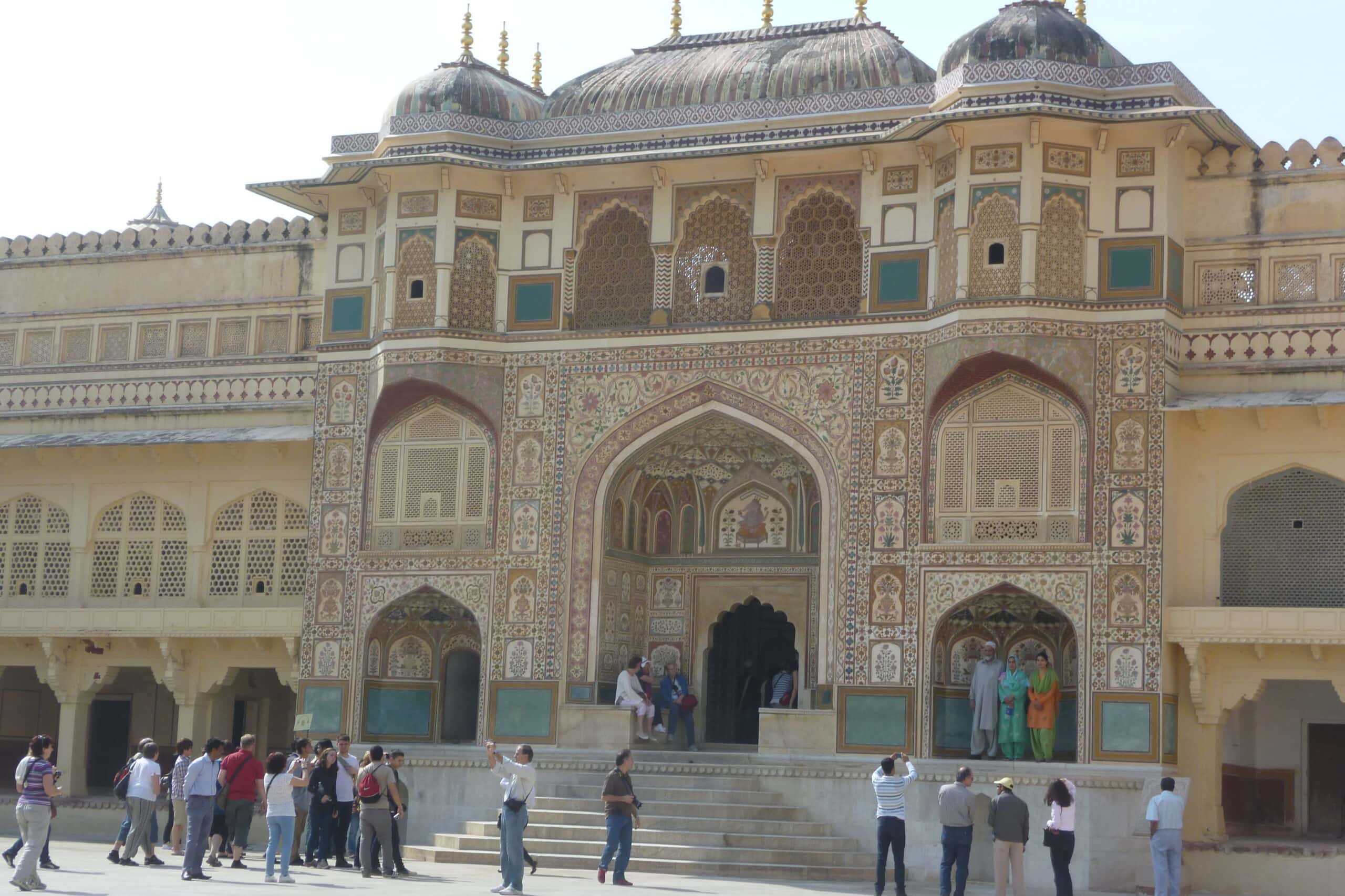 Wir erfahren von unserem Palast-Guide, dass Jaipur eine sehr reiche Stadt ist, weil der damalige Herrscher Man Singh sich nicht nur mit den muslimischen Nachbarn gut gestellt, sondern auch gleich dort eingeheiratet hat (ich weiß, man liest auch die umgekehrte Version, dass nämlich der Großmogul Akbar eine Hindu-Prinzessin aus Amber geheiratet hat, aber die Version unseres Fort-Guides passt besser zur Fortsetzung). Man Singh unterstützte Akbar bei seinen Kriegszügen und hatte ausgehandelt, dass Akbar das eroberte Land bekommt und Man Singh die erbeuteten finanziellen Mittel, also Geld und Edelsteine. So wurde aus Amber eine der reichsten und friedlichsten Provinzen Rajasthans. Und aufgrund dieser Hochzeiten finden sich in Jaipur und insbesondere im Fort viele Zeichen muslimischer Kunst und Architektur. Es war mal wieder ein sehr aufschlussreicher Vortrag, von dem wir aber nicht mal einen Bruchteil behalten haben.