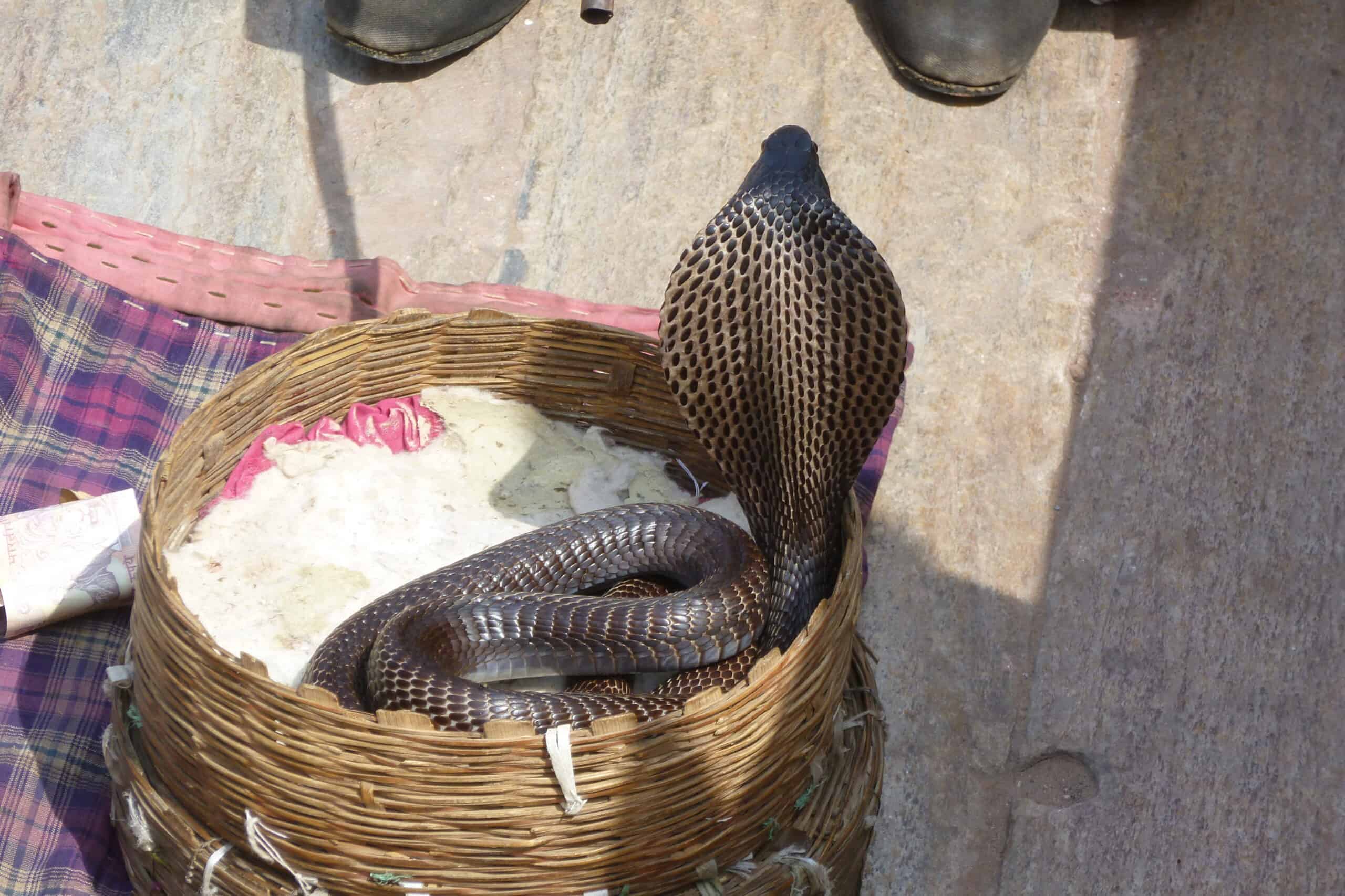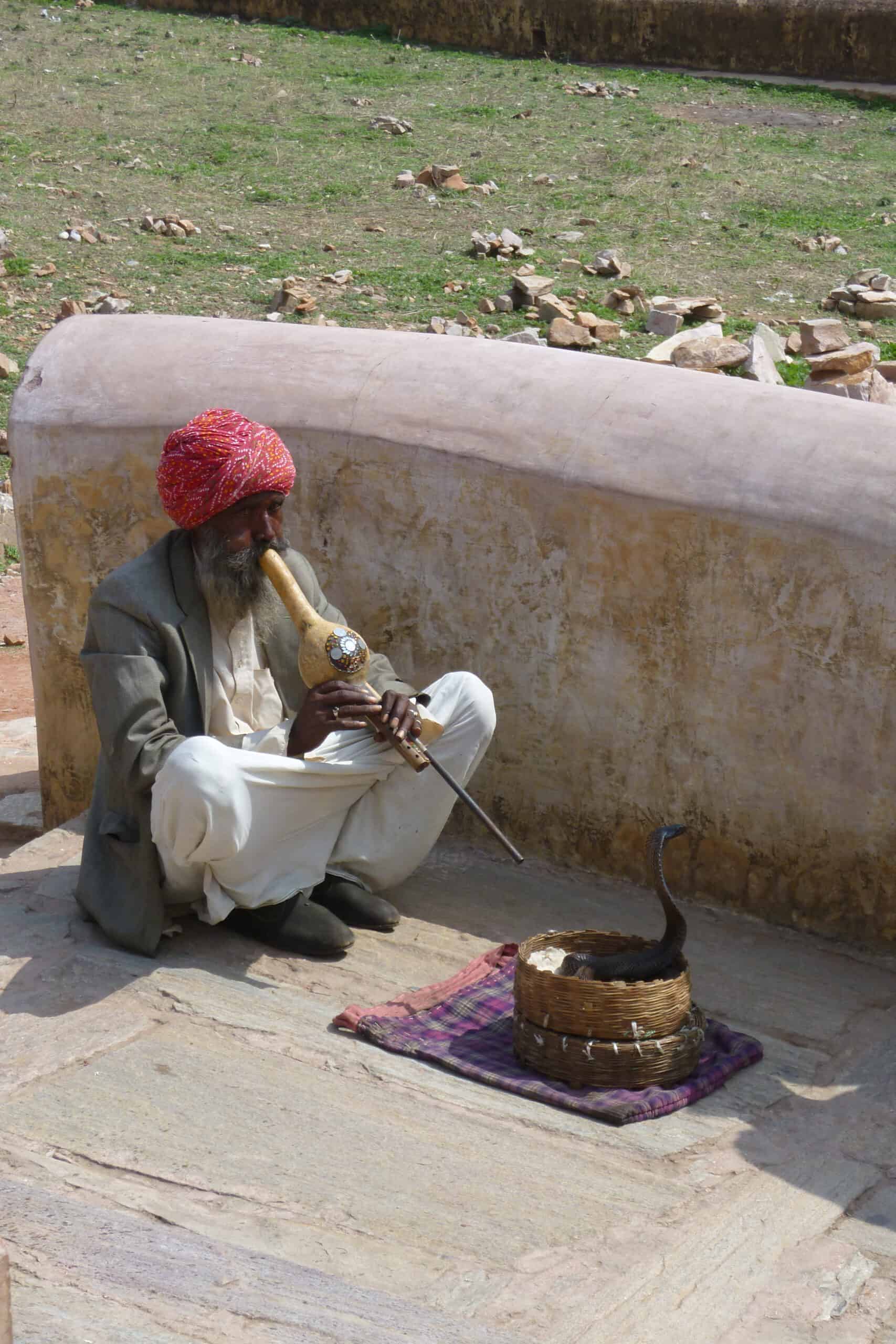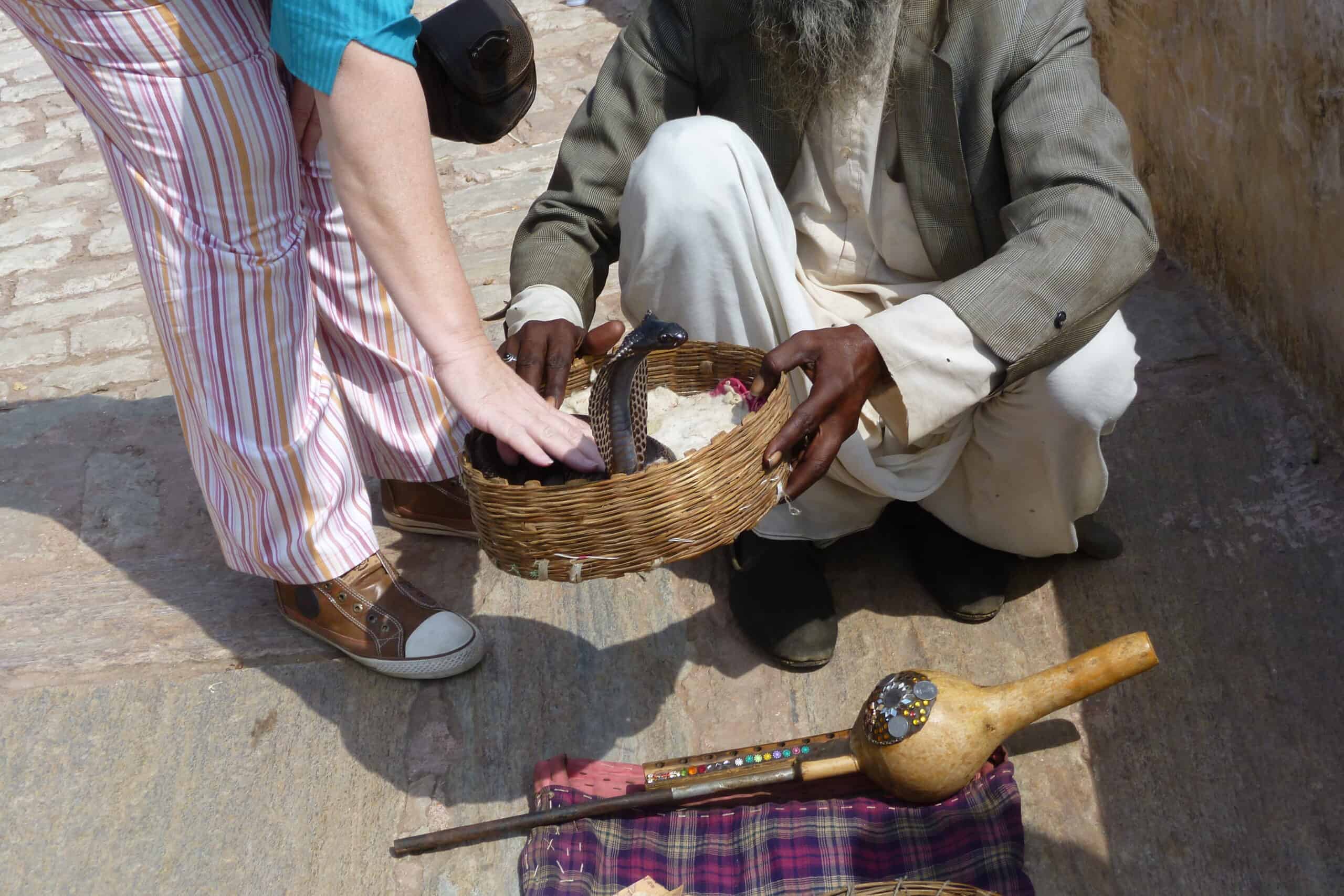 Auf unserem Abstieg von der Burg kommen wir an einem Schlangenbeschwörer vorbei. Er sitzt mit Flöte und Kobra in der Sonne. Veer will wissen, ob ich Schlangen mag. Ja, eigentlich mag ich Schlangen, aber eine Kobra würde ich nicht unbedingt anfassen. Er meint, das sei kein Problem, der Schlangenbeschwörer hätte der Kobra längst das Gift entzogen und ich könnte sie ruhig anfassen. Gegen ein kleines Trinkgeld ist der Schlangenbeschwörer auch bereit, mich mit dem Tier spielen zu lassen. Die Kobra ist wirklich ein schönes Exemplar und lässt sich zunächst bereitwillig streicheln, aber nach ein paar Minuten fängt sie an zu zischeln und ich denke, es ist wohl besser, sie in Ruhe zu lassen.