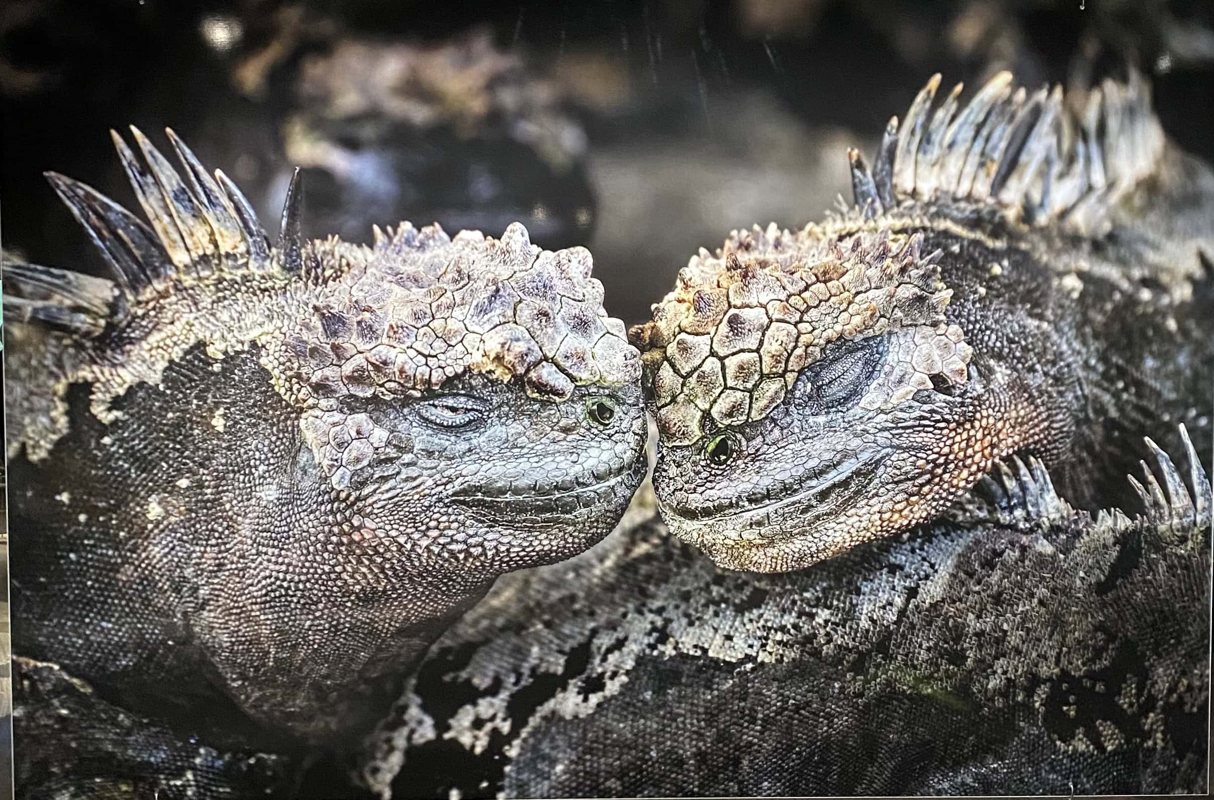 Zwei Meerechsen, die sich auf einem Lavafelsen der Galapagos-Inseln aufwärmen. Auch wenn sie nicht so aussehen: Sie sind völlig harmlos.