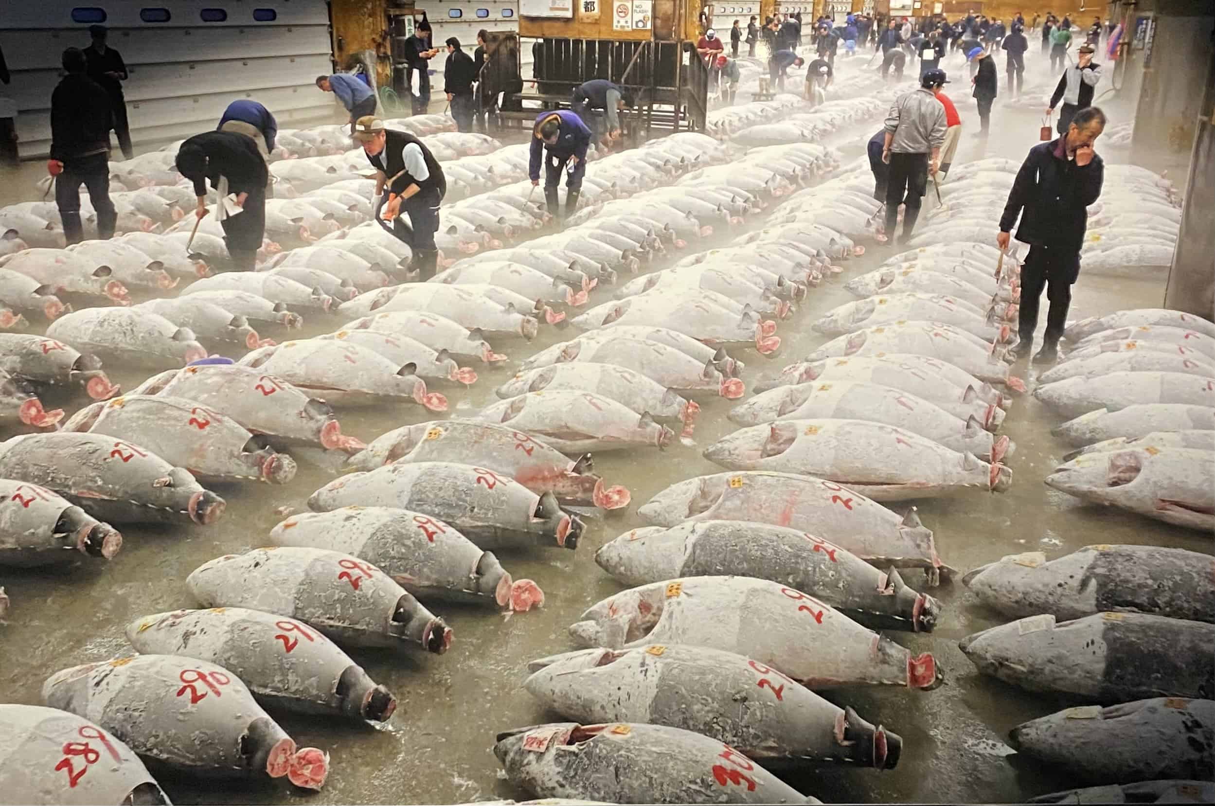 Gefrorener Thunfisch auf dem Fischmarkt in Tokio. Für die Händler sind die abgetrennten Schwanzenden ein Indiz für die Frische und Qualität der Tiere.