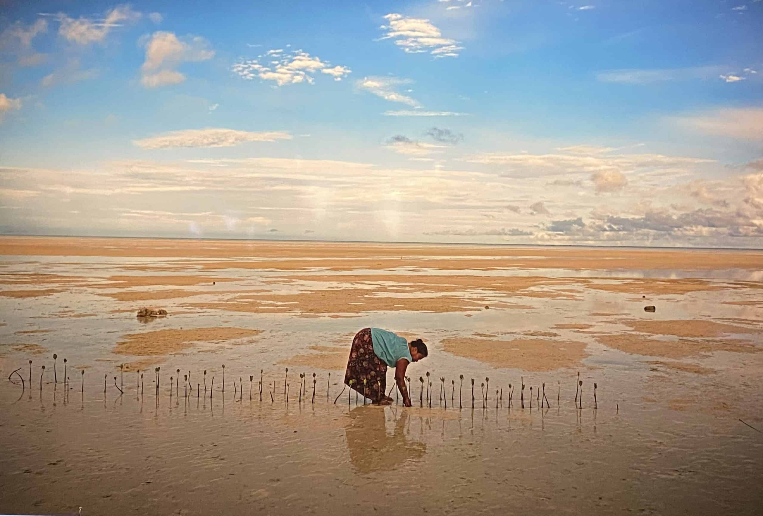 Im seichten Schlick an der Pazifikküste Kiribatis nutzt diese Bewohnerin die Ebbe, um kleine Mangrovenpflanzen zu pflegen, die sie vor Kurzem angepflanzt hat. Sie hofft, dass diese Bäumchen später einen Schutzwall gegen die Erosion der Küste bilden. Es dürfte 20 bis 30 Jahre dauern, bis hier ein dichter Mangrovenwald entsteht, und diese Frau weiß, dass sie das wahrscheinlich nicht mehr erleben wird. Spätere Generationen aber werden ihr für diese Arbeit danken.