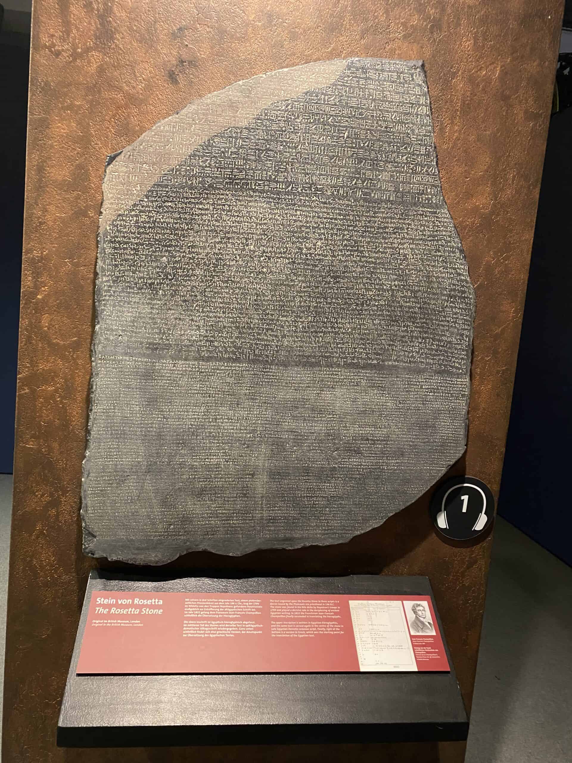 Als Erstes aber trifft der Besucher auf den Stein von Rosetta, der 1799 von napoleonischen Truppen im Nildelta gefunden wurde.