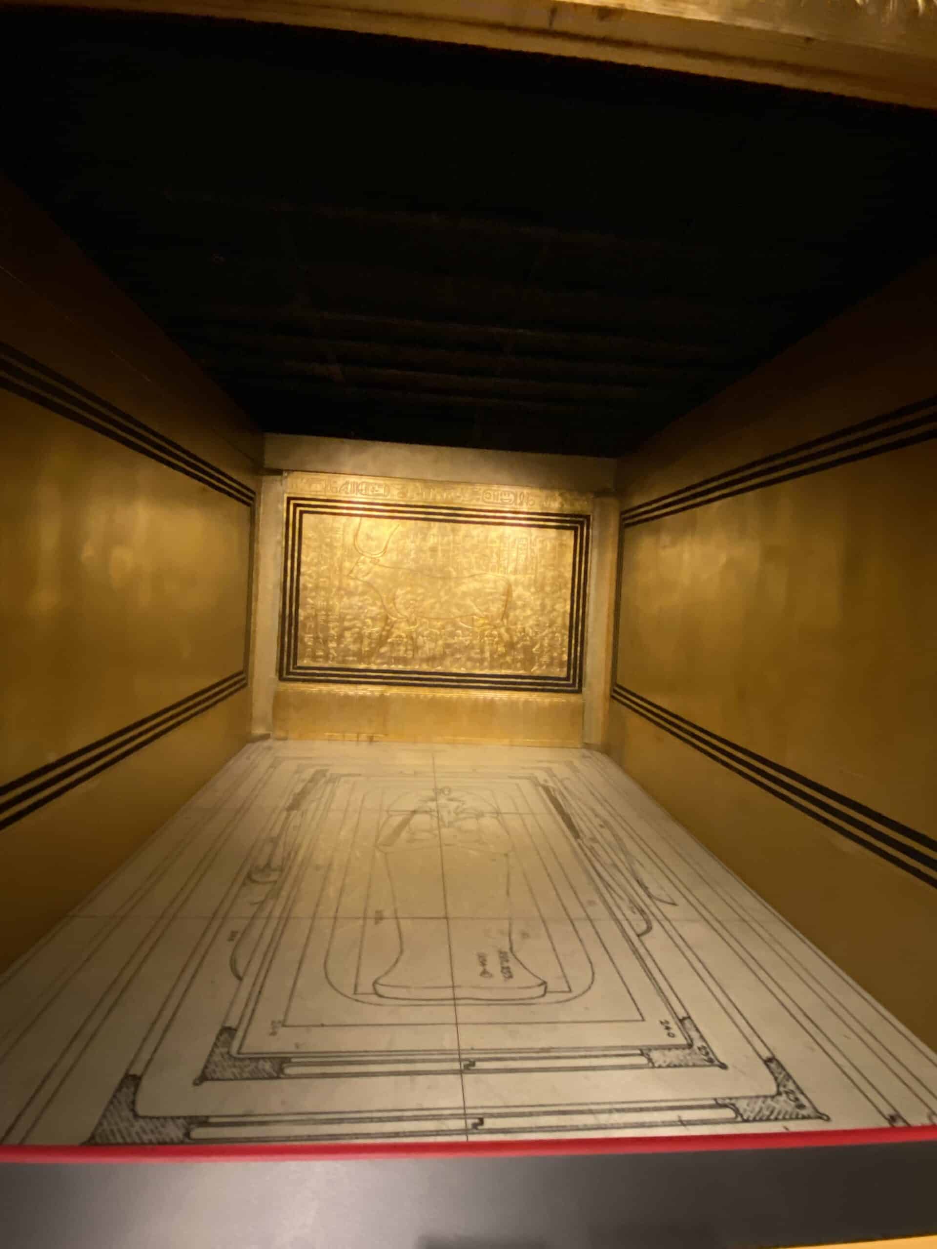 Was hochinteressant ist – und mir gar nicht so bewusst war -, ist, dass der Sarkophag praktisch aus vier Umhüllungen besteht, die um die Mumie herum aufgebaut werden. Hier ist der äußere Schrein in Originalgröße. Auf dem Boden sieht man aufgemalt die Umrisse der anderen drei Schreine sowie die Lage der Mumie.