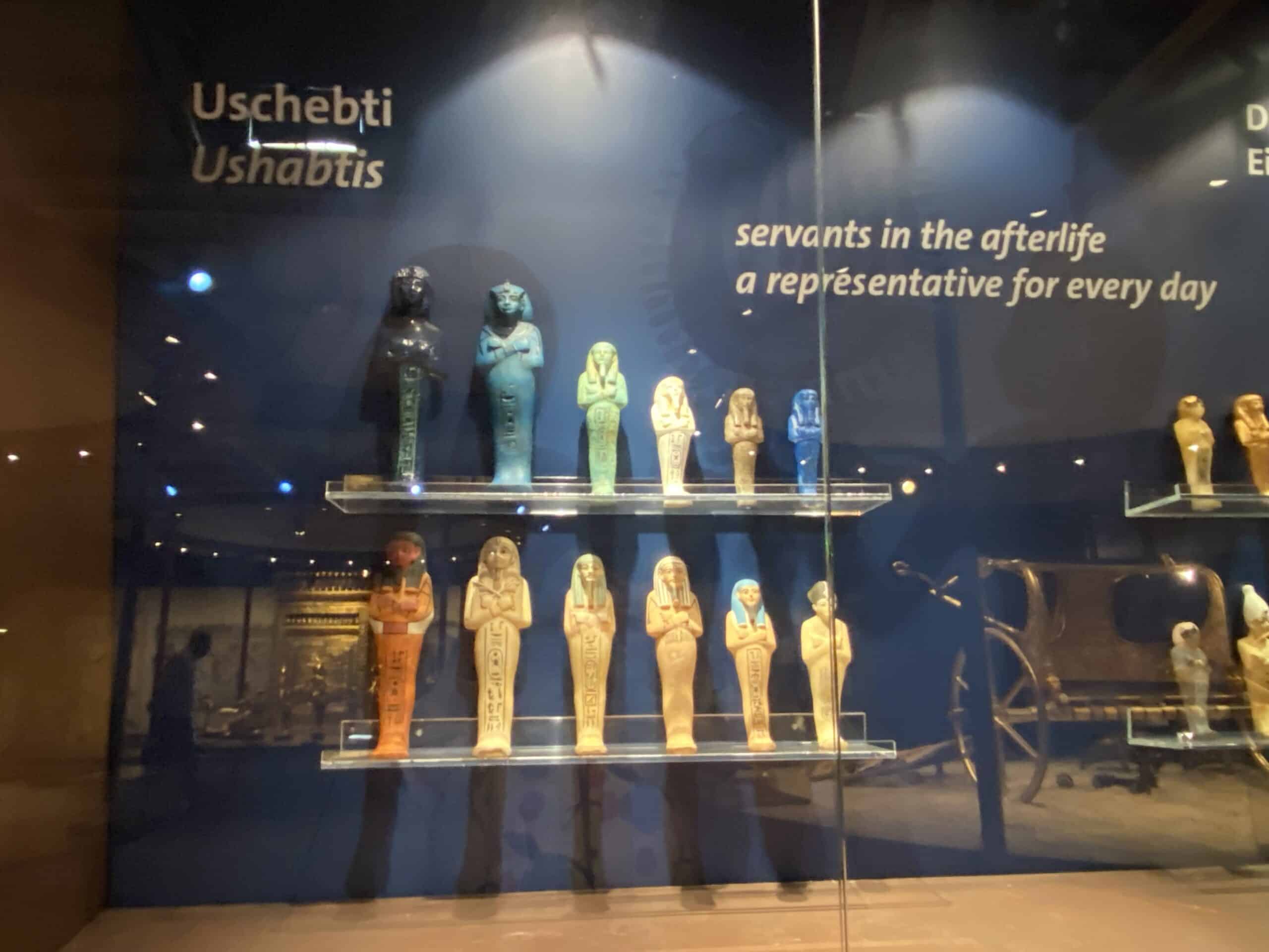 Aber man war ja nicht umsonst Pharao. Man hatte im Leben seine Diener und so auch nach dem Tod. Daher wurden den Pharaonen sogenannte Uschebti mit ins Grab gegeben. Diese sollten den Verstorbenen im Jenseits alle unangenehmen Arbeiten auf den Feldern in der Unterwelt abnehmen. Tutanchamun bekam 413 Uschebtis mit ins Grab gelegt (üblich waren eher zwei) – einen für jeden Tag des Jahres, 36 Aufseher für die Dekaden und 12 Oberaufseher für die Monate.