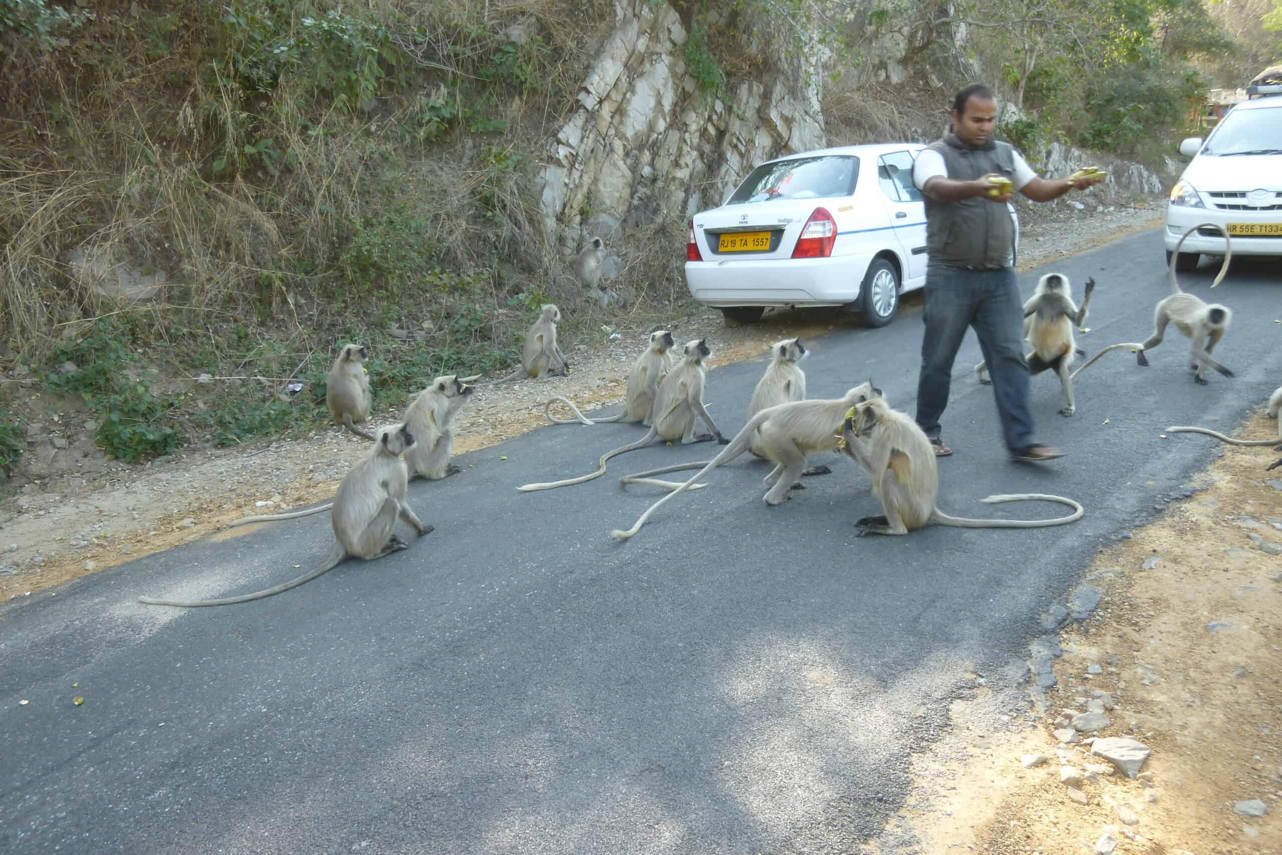 Doch bis wir die 9 Stunden Fahrt hinter uns gebracht haben werden, machen wir noch drei Zwischenstopps. Das erste Mal hält unser Fahrer rund 30 km hinter Ranakpur mitten auf der Straße an. Unser Guide Veer steigt aus, öffnet den Kofferraum und kommt mit einem Sack Bananen zurück. Kaum ist der Sack geöffnet, sind wir von Affen umringt. Anscheinend kennen sie dieses Ritual schon. Veer erklärt, dass er sie immer füttere, wenn er diese Strecke fahre. Es ist unglaublich, wo diese Affen überall herkamen – sie fielen förmlich aus den Bäumen, kamen die Abhänge herauf- und heruntergesprungen und in kürzester Zeit waren wir beliebte Mitglieder einer Affenherde.