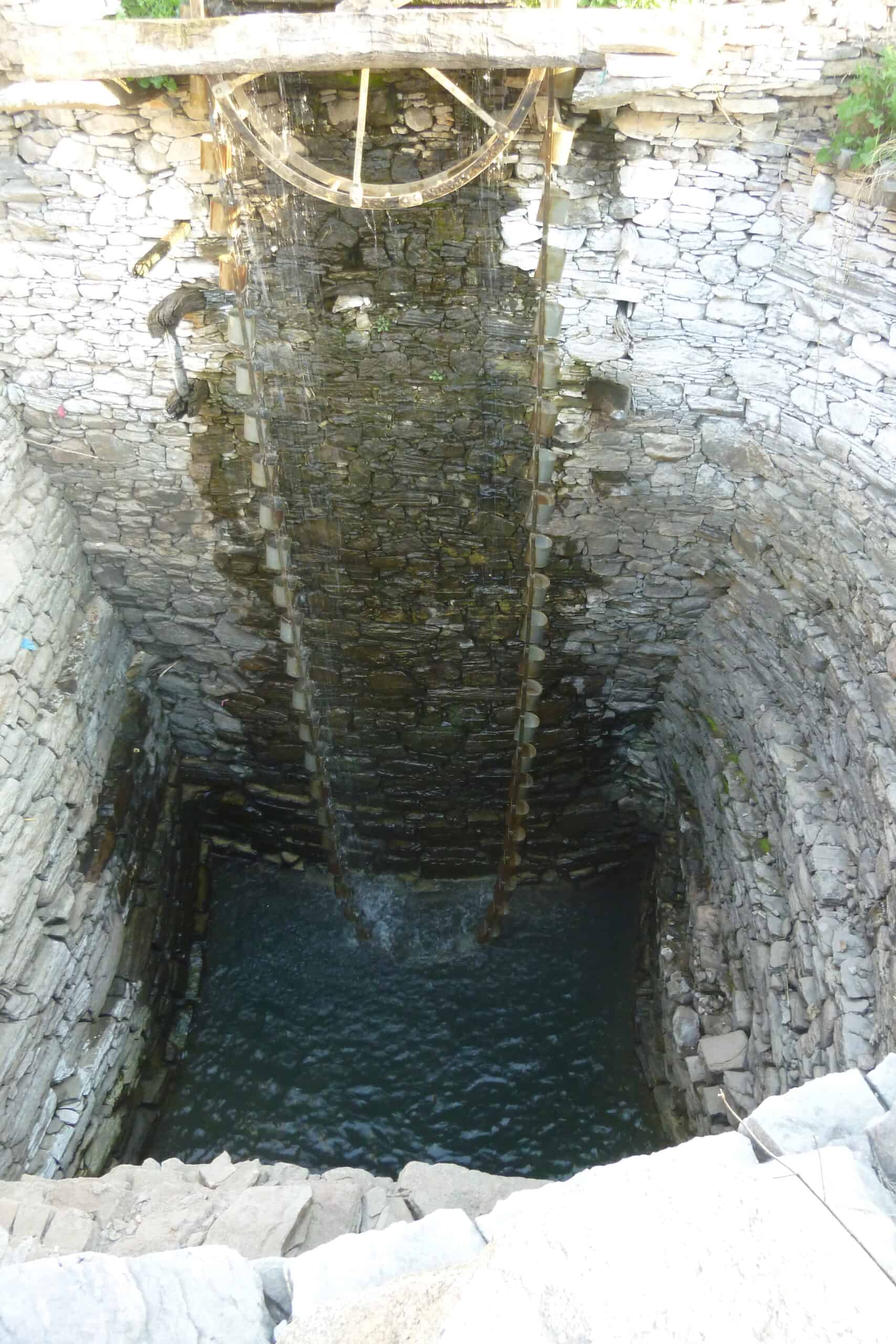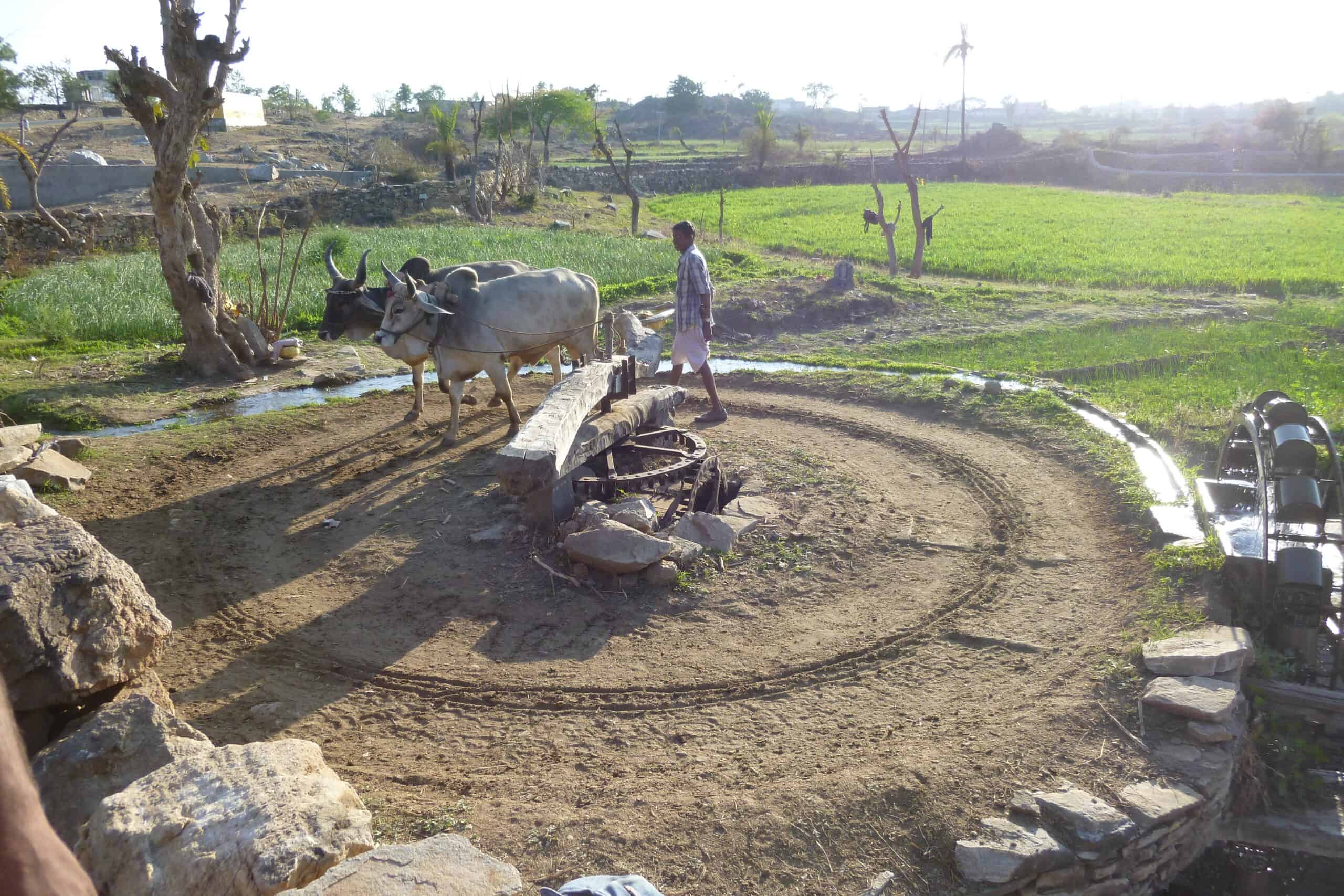 Den zweiten Stopp legen wir an einem freien Feld ein. Hier sehen wir, wie ein Bauer seine Felder bewässert bzw. einen künstlich angelegten Bach mit Wasser versorgt. Es gibt einen ziemlich tiefen Brunnen, auf dessen Rand ein Rad befestigt ist, über das eine lange Kette geführt wird, die mit rund 30 kleinen Eimerchen bestückt ist. Um das Rad anzutreiben, führt der Bauer Stunden um Stunden eine Kuh im Kreis herum, die das Rad in Bewegung setzt. Die Eimerchen tauchen ins Wasser, kommen gefüllt hoch und entleeren sich in einen Trog, der wiederum an einem Ende offen ist, so dass das Wasser sich in den Bach entleeren kann. Der Bach bewässert sein kleines Feld, auf dem im Grunde alles angebaut wird, was der Bauer und seine Familie zum Leben brauchen. Außerdem dient der Bach den umliegenden Familien als Wasserstelle, wo die Frauen Trinkwasser in große Gefäße abfüllen, die sie auf ihrem Kopf nach Hause tragen. Sisyphos lässt grüßen!