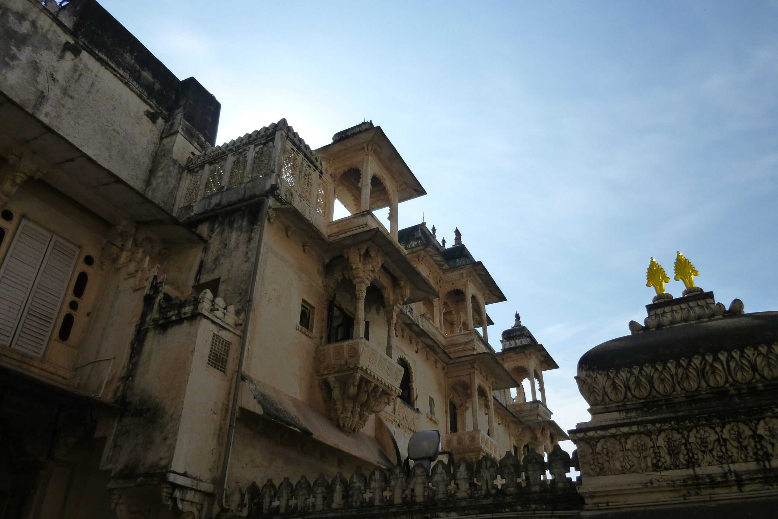 Als Veer uns abholt, fragen wir ihn, warum die Stufen denn so hoch und die Aufgänge so eng sind. Die Erklärung ist einleuchtend: Das Hotel – wie viele andere Gebäude auch – stammte aus einer Zeit, in der kriegerische Überfälle seitens der Mogule (oder, wie er es aussprach, der Muggels) an der Tagesordnung waren. Um sie bei einem Angriff daran zu hindern, zu schnell oder auf ihren Pferden anzugreifen, hat man sich auf diese wirkungsvolle Bauweise versteift. Wie wir bald feststellen durften, gibt es in Udaipur fast nur alte Häuser …